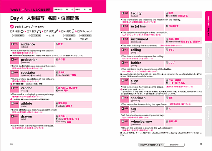 「でる単5ステップ」を使った1日の学習は1日たったの4ページ 週末は、「全単語の総チェック」、「ウイークリーチェック」で一週間の総復習。