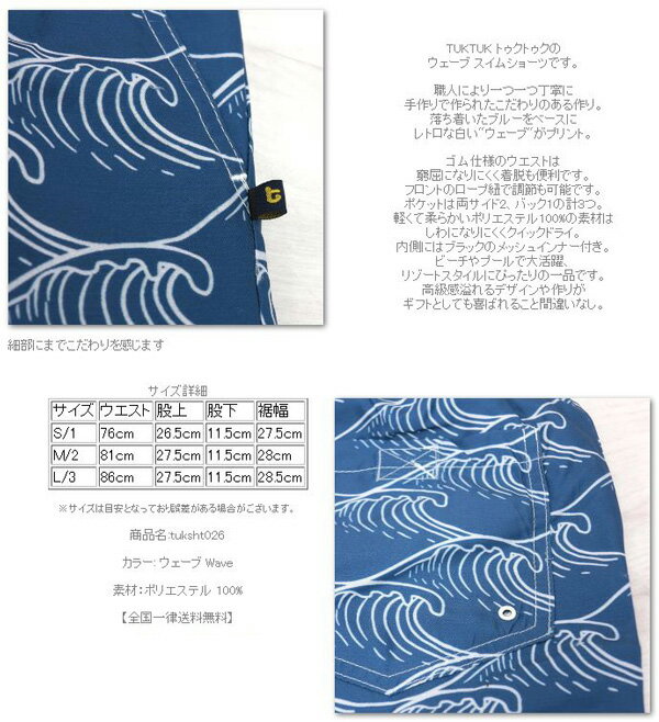 TUKTUK トゥクトゥク スイムショーツ 海パン 水着 ショートパンツ ウェーブ メンズ 細部にまでこだわりを感じます サイズ詳細 サイズウエスト股上股下裾幅 S/176cm26.5cm11.5cm27.5cm M/281cm27.5cm11.5cm28cm L/386cm27.5cm11.5cm28.5cm ※サイズは目安となっており誤差がある場合がございます。