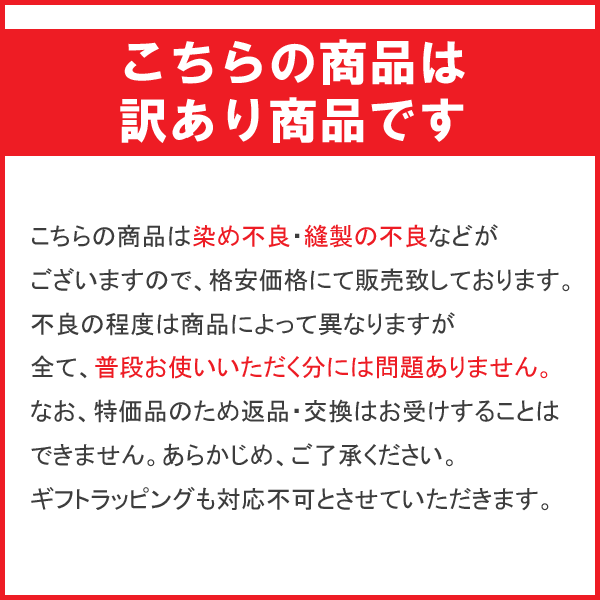 染め不良・縫製不良などがありますが、普段お使いいただく分には全く問題ありません。