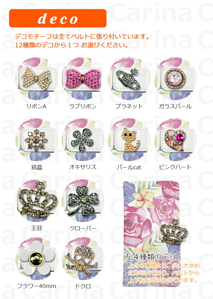 ケース詳細ケースタイプ:手帳型(ベルトあり)手帳生地素材:合皮レザー(ポリウレタン)内部ケース素材:ハードケース(ポリカボネート)手帳機能・特徴:カードホルダー、ストラップホール、カメラホール、マグネットクロージャーデコモチーフ:リボンA、ラブリボン、プラネット、ガラスパール、結晶、オキサリス、パールcat、ピンクハート、王冠、クローバー、フラワー40mm、ドクロ※いずれか1つになります。